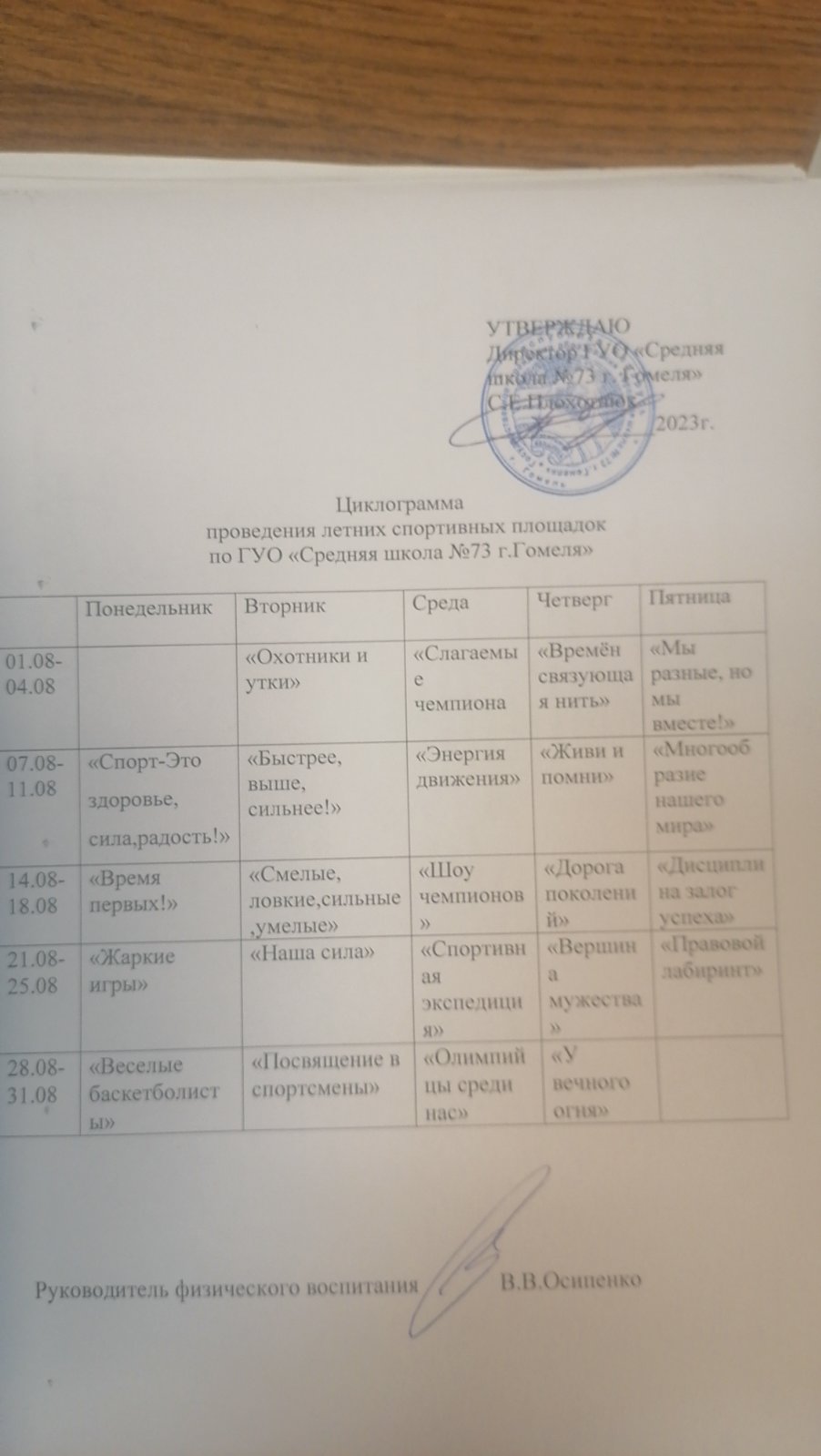 Циклограмма проведения летних спортивных площадок по ГУО «Средняя школа №73 г.Гомеля» в августе