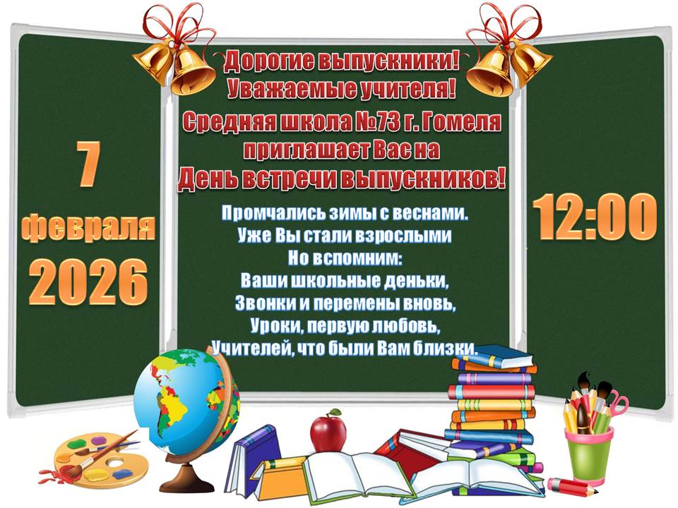 7 февраля, в рамках Дня встречи выпускников, в ГУО "Средняя школа №73 г.Гомеля" состоится круглый стол "Давайте вспомним"! Приглашаются выпускники прошлых лет!!!