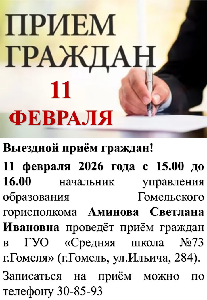 11 февраля 2026 года с 15.00 до 16.00 начальник управления образования Гомельского горисполкома Аминова Светлана Ивановна проведёт приём граждан в ГУО «Средняя школа №73 г.Гомеля» (г.Гомель, ул.Ильича, 284).